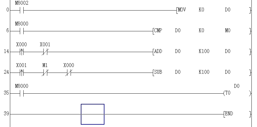![]() M8000初始化D0,若D0的值等于0則不能再減小,X0每接通一次定時(shí)器增加1S,X1接通一次定時(shí)器減少1S。 這個(gè)程序的缺點(diǎn)是每次斷電后需要重新設(shè)置時(shí)間值。 如果想停機(jī)后保存時(shí)間值可以把D0換成D128。 [ 此帖被chenpingyg在2011-05-23 00:52重新編輯 ] |