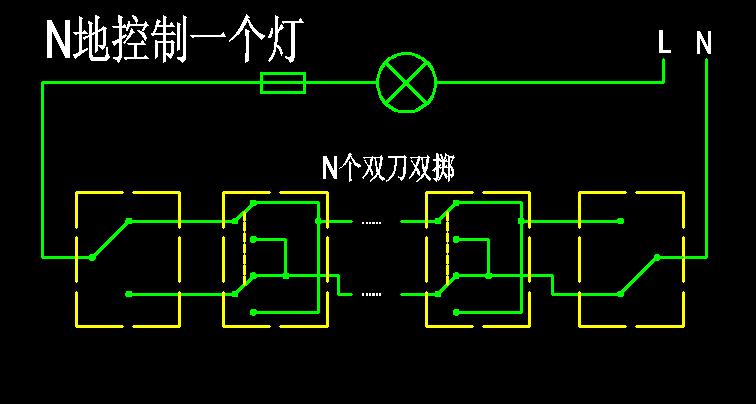 第一行都是常閉,當(dāng)隨便一個(gè)斷開,則二、三、四行中有一行是有兩個(gè)處于閉合狀態(tài),由另一個(gè)可以控制燈。