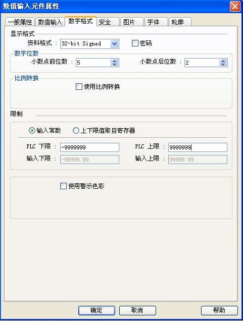 觸摸屏數(shù)據(jù)類(lèi)型選擇有符號(hào)數(shù),并注意正確的設(shè)定上下限 ![]() |