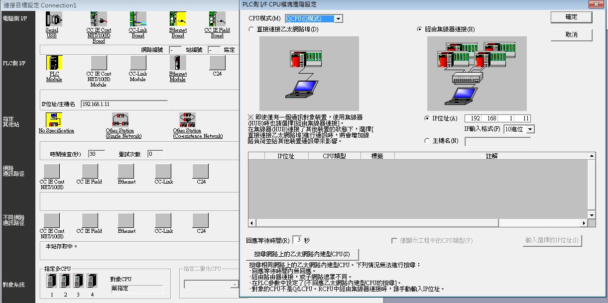 在連PLC側(cè)設(shè)定 PLC Module並點(diǎn)擊圖示設(shè)定PLC IP 或是搜尋IP