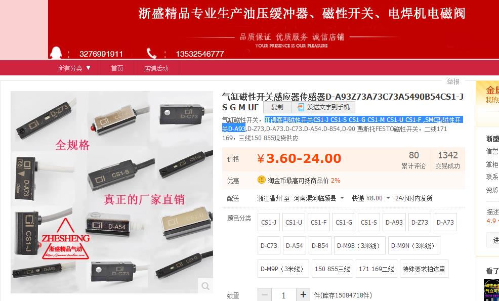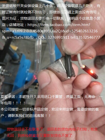 安裝設備需要,從**寶浙盛精品啟動液壓,購買幾十條磁敏開關,安裝到設備調試耽誤幾天時間,后安裝其他開關問題發(fā)現(xiàn)磁敏開關質量問題,即便把開關放在強磁上面有時也不會有任何信號,和客服聯(lián)系讓退回看看,退回去簽收以后不在回復任何信息,以剪線為名拒絕退貨(注:還有沒剪線的),買來開關是用的,不是看的,不安裝機器設備上面怎么能知道質量有問題,難道在一條一條的把整臺設備都拆掉,各位有什么好的建議,到什么地方鑒定商品是假冒偽劣