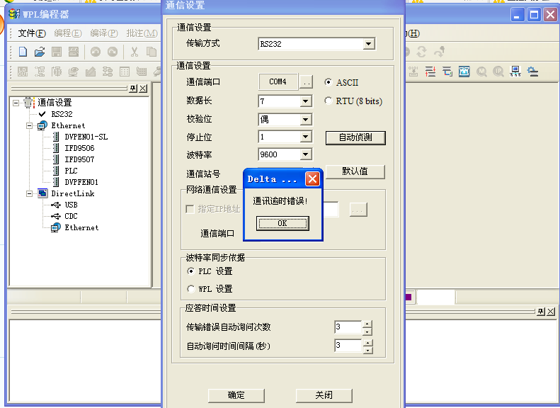 通訊線拔了 重新插再試試  臺(tái)達(dá)有這種現(xiàn)象 通訊參數(shù)是9600,7,E,1  站號(hào)默認(rèn)的是0 不行就重啟電腦