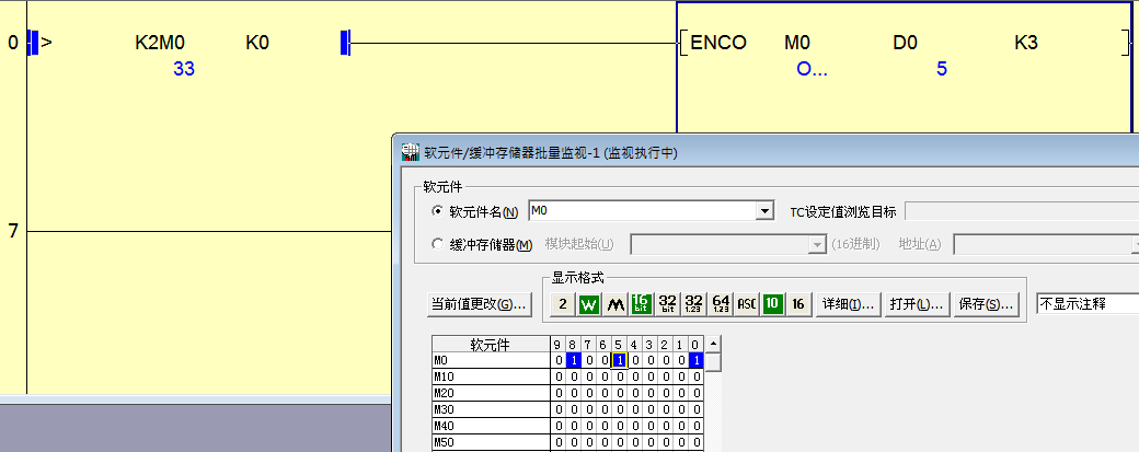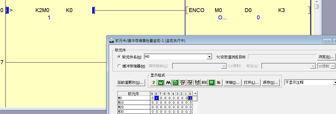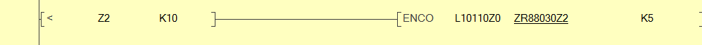 這是編碼器指令 當S開始2的n次方位數(shù)中有bit on的話顯示其位置於D 以我的範例解說 ![]() S為M0 N為3 D為0 M0 ON 為bit_0 結(jié)果為D0=0 若S範圍內(nèi)沒有bit on會跳錯誤 ![]() D0會以最高位Bit為結(jié)果 M5 M0 ON M5為 bit_5 D0=5 而你的程式還加上Z來做間接定址和使用ZR文件寄存器 所以看起來比較複雜 |