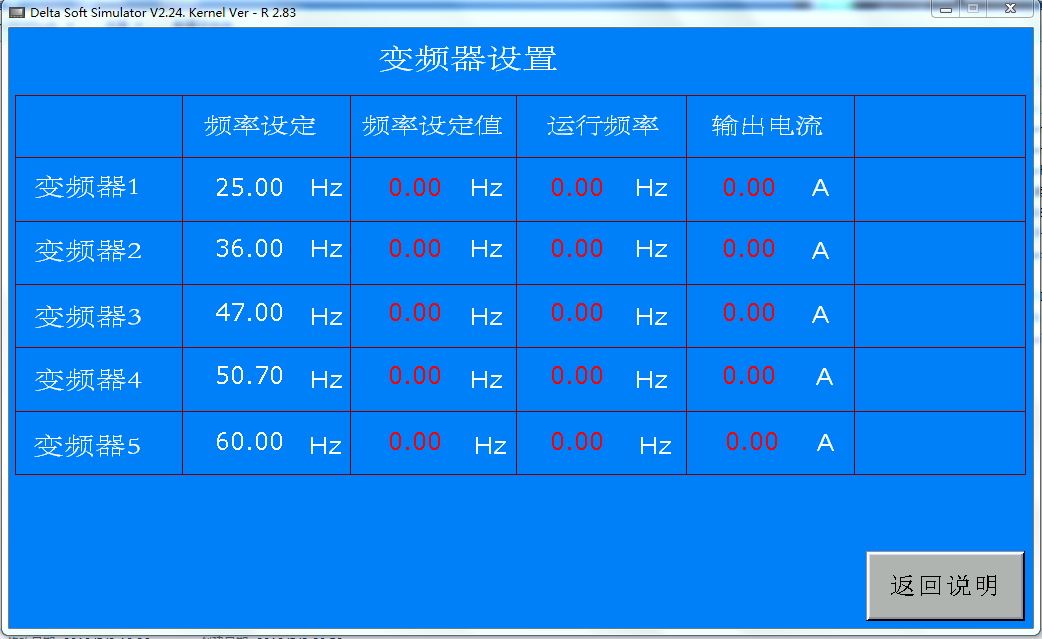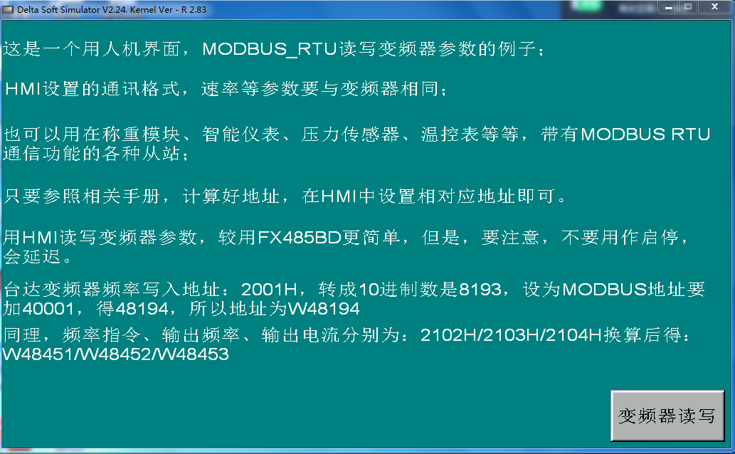 1.本貼為臺達HMI與多臺變頻器直接通訊,寫入設定頻率,讀取設定頻率值、運行頻率、輸出電流值的例子;