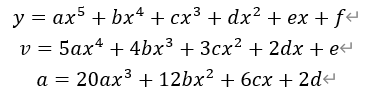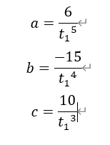 五次其實就對于三個公式,將起點終點的速度,加速度,還有位置帶入求解6個系數(shù),然后就能求出曲線方程。由于三菱PLC沒有矩陣,解方程之類的庫,所以只考慮一種特殊情況下的解,就是起點結束點速度,加速度均為0的情況