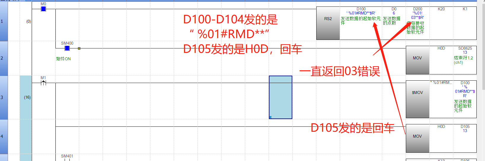 發(fā)的報文時對的,發(fā)送這個字符串:“ %01#RMD**”加上回車(H0D),然后傳感器會自動返回測量的距離,我用Q系列QJ71C24N是成功過的, 不知道為什么在FX5U上就不行