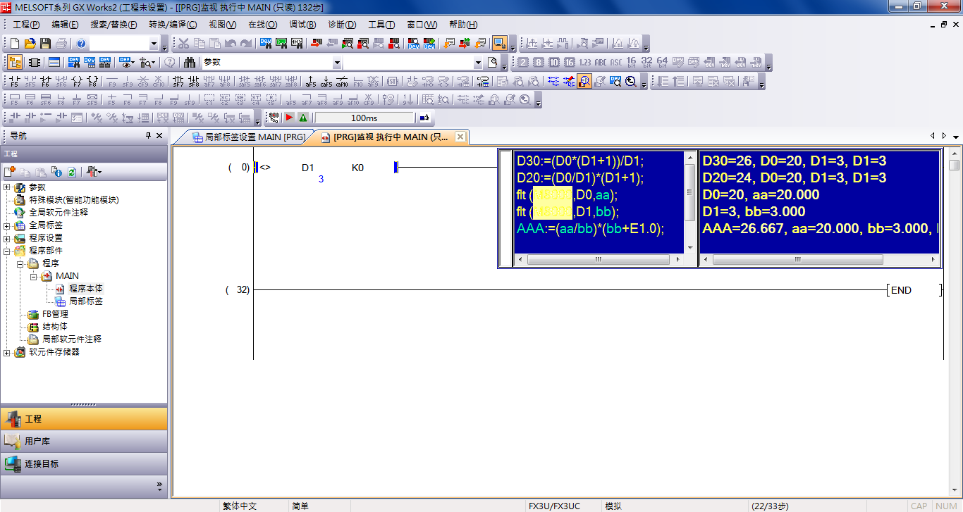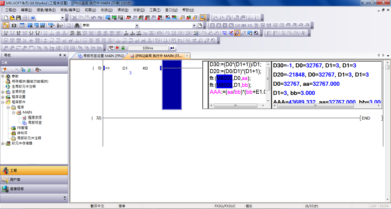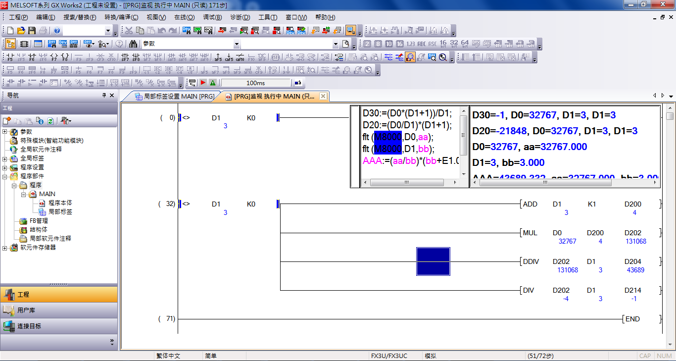 在PLC作計(jì)算時(shí)要考慮到乘除的轉(zhuǎn)換,在計(jì)算乘法會(huì)變成32位元,而除法時(shí)會(huì)有商數(shù)跟餘數(shù),且除數(shù)不得為零