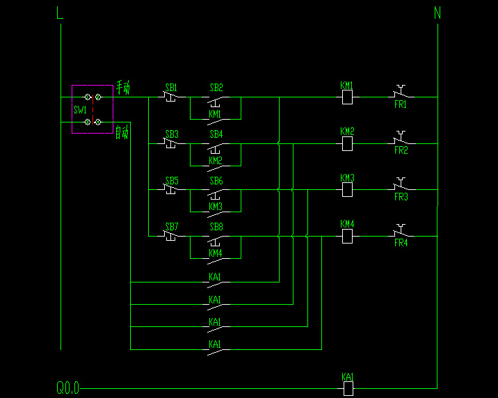 ![]() 自動時Q0.0有輸出四臺電機同時啟動, 手動時可單臺啟動, 請大家發(fā)表意見可行否? |