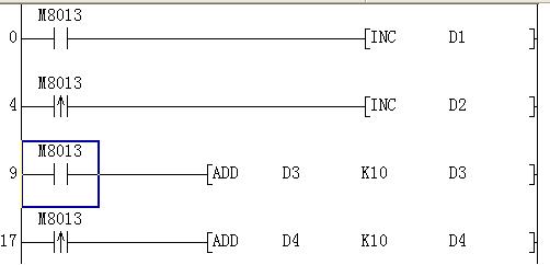 引用引用第1樓崇慶陽(yáng)光于2007-06-12 19:57發(fā)表的 :M8013是秒脈沖;象你的這個(gè)程序PLC運(yùn)行1個(gè)周期只要約3ms(FX2N),1000/3=330...在1秒鐘之內(nèi),D3要累計(jì)相加約330次之多...在1秒之內(nèi)D4只相加1次,這是很準(zhǔn)確的;而D3在每1秒之內(nèi)相加的次數(shù)是不確定的,除非你設(shè)定PLC定時(shí)掃描方式..........