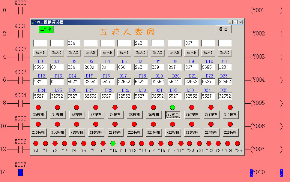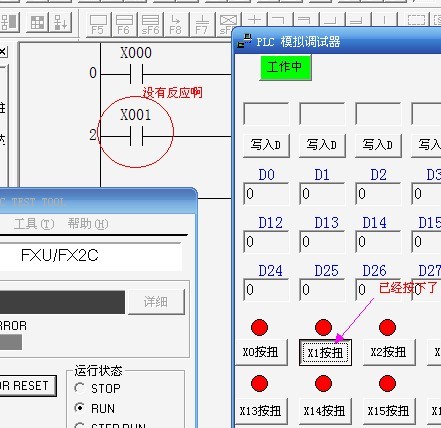 可對(duì)X輸入點(diǎn)進(jìn)行按制,監(jiān)控輸入輸出狀態(tài)、D數(shù)值輸入、輸出顯示。