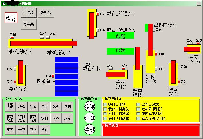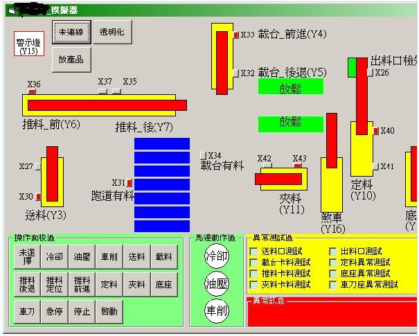 把異常集中在一點(diǎn),是方便你對PLC程式除錯。 vb程式可以對你設(shè)定的異常點(diǎn)區(qū)域作搜尋比對,只要其中一個點(diǎn)=on,就是有異常。 底下部份程式給你參考看看。設(shè)一個time去掃程式。 Private Sub tmrAlarm_Timer() Dim I As Integer Dim J As Integer Dim sDATA(100) As String Dim mData(100) As Integer '讀取M值狀態(tài) sDATA(0) = ReadM(300) gf = PLC.ReadDeviceRandom2(sDATA(0), CLng(10), mData(0)) sDATA(1) = ReadM(310) gf = PLC.ReadDeviceRandom2(sDATA(1), CLng(10), mData(10)) sDATA(2) = ReadM(320) gf = PLC.ReadDeviceRandom2(sDATA(2), CLng(10), mData(20)) sDATA(3) = ReadM(330) gf = PLC.ReadDeviceRandom2(sDATA(3), CLng(10), mData(30)) sDATA(4) = ReadM(340) gf = PLC.ReadDeviceRandom2(sDATA(4), CLng(10), mData(40)) sDATA(5) = ReadM(350) gf = PLC.ReadDeviceRandom2(sDATA(5), CLng(10), mData(50)) sDATA(6) = ReadM(360) gf = PLC.ReadDeviceRandom2(sDATA(6), CLng(10), mData(60)) sDATA(6) = ReadM(370) gf = PLC.ReadDeviceRandom2(sDATA(7), CLng(10), mData(70)) sDATA(8) = ReadM(380) gf = PLC.ReadDeviceRandom2(sDATA(8), CLng(10), mData(80)) For N = 0 To 9 M(300 + N) = mData(N) M(310 + N) = mData(N + 10) M(320 + N) = mData(N + 20) M(330 + N) = mData(N + 30) M(340 + N) = mData(N + 40) M(350 + N) = mData(N + 50) M(360 + N) = mData(N + 60) M(370 + N) = mData(N + 70) M(380 + N) = mData(N + 80) Next N lblAlarm = "" If M(301) Then lblAlarm = lblAlarm & "M301:送料口異常" If M(302) Then lblAlarm = lblAlarm & "M302:無料警告" If M(303) Then lblAlarm = lblAlarm & "M303:載臺異常" If M(304) Then lblAlarm = lblAlarm & "M304:推料異常" If M(305) Then lblAlarm = lblAlarm & "M305:夾料異常" If M(306) Then lblAlarm = lblAlarm & "M306:出料口異常" If M(307) Then lblAlarm = lblAlarm & "M307:定位異常" If M(308) Then lblAlarm = lblAlarm & "M308:底座異常" If M(309) Then lblAlarm = lblAlarm & "M309:車刀座異常" If M(320) Then lblAlarm = lblAlarm & "M320:無料警告" If M(321) Then lblAlarm = lblAlarm & "M321:載臺前進(jìn)異常" If M(322) Then lblAlarm = lblAlarm & "M322:載臺後進(jìn)異常" If M(323) Then lblAlarm = lblAlarm & "M323:推料定位異常" If M(324) Then lblAlarm = lblAlarm & "M324:推料前進(jìn)異常" If M(325) Then lblAlarm = lblAlarm & "M325:推料後退異常" If M(326) Then lblAlarm = lblAlarm & "M326:夾料前進(jìn)異常" If M(327) Then lblAlarm = lblAlarm & "M327:夾料後退異常" If M(328) Then lblAlarm = lblAlarm & "M328:定位前進(jìn)異常" If M(329) Then lblAlarm = lblAlarm & "M329:定位後退異常" If M(330) Then lblAlarm = lblAlarm & "M330:底座前進(jìn)異常" If M(331) Then lblAlarm = lblAlarm & "M331:底座後退異常" If M(332) Then lblAlarm = lblAlarm & "M332:車刀座前進(jìn)異常" If M(333) Then lblAlarm = lblAlarm & "M333:車刀座後退異常" End Sub |